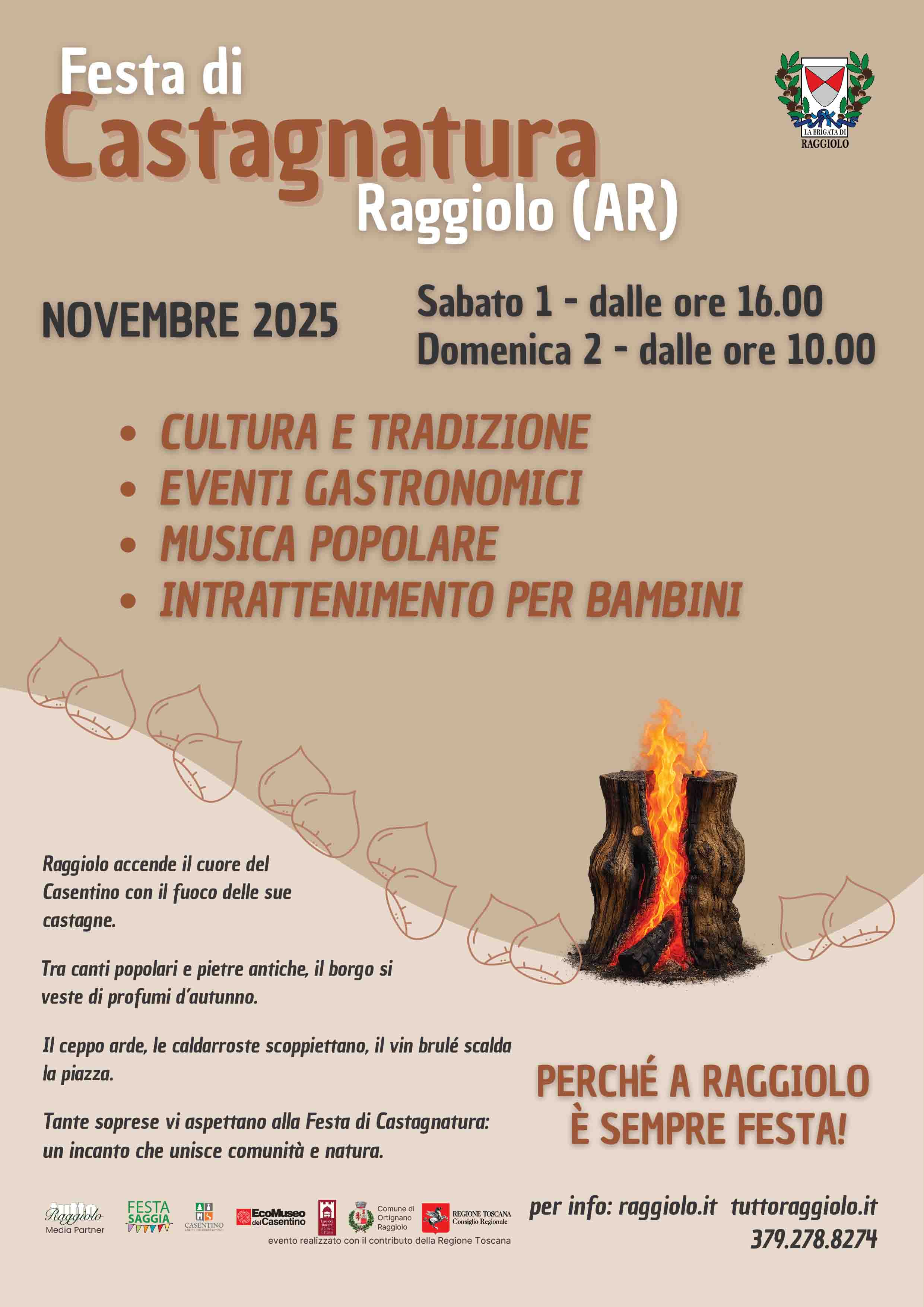 Due giorni per celebrare sapori, colori e atmosfere dell’autunno. Il borgo di Raggiolo rinnova l’ormai tradizionale appuntamento con la Festa di Castagnatura che, sabato 1 e domenica 2 novembre, proporrà un ricco calendario di iniziative per tutte le età tra spettacoli, degustazioni, musica, rievocazioni, mercatini e racconti davanti al fuoco. L’evento è organizzato dalla Brigata di Raggiolo in collaborazione con Comune di Ortignano Raggiolo ed EcoMuseo del Casentino con l’obiettivo di valorizzare la filiera della castagna che, per secoli, è stata alla base dell’economia e dell’alimentazione locale, andando così a tenere vive le memorie del passato per tramandarle alle future generazioni.