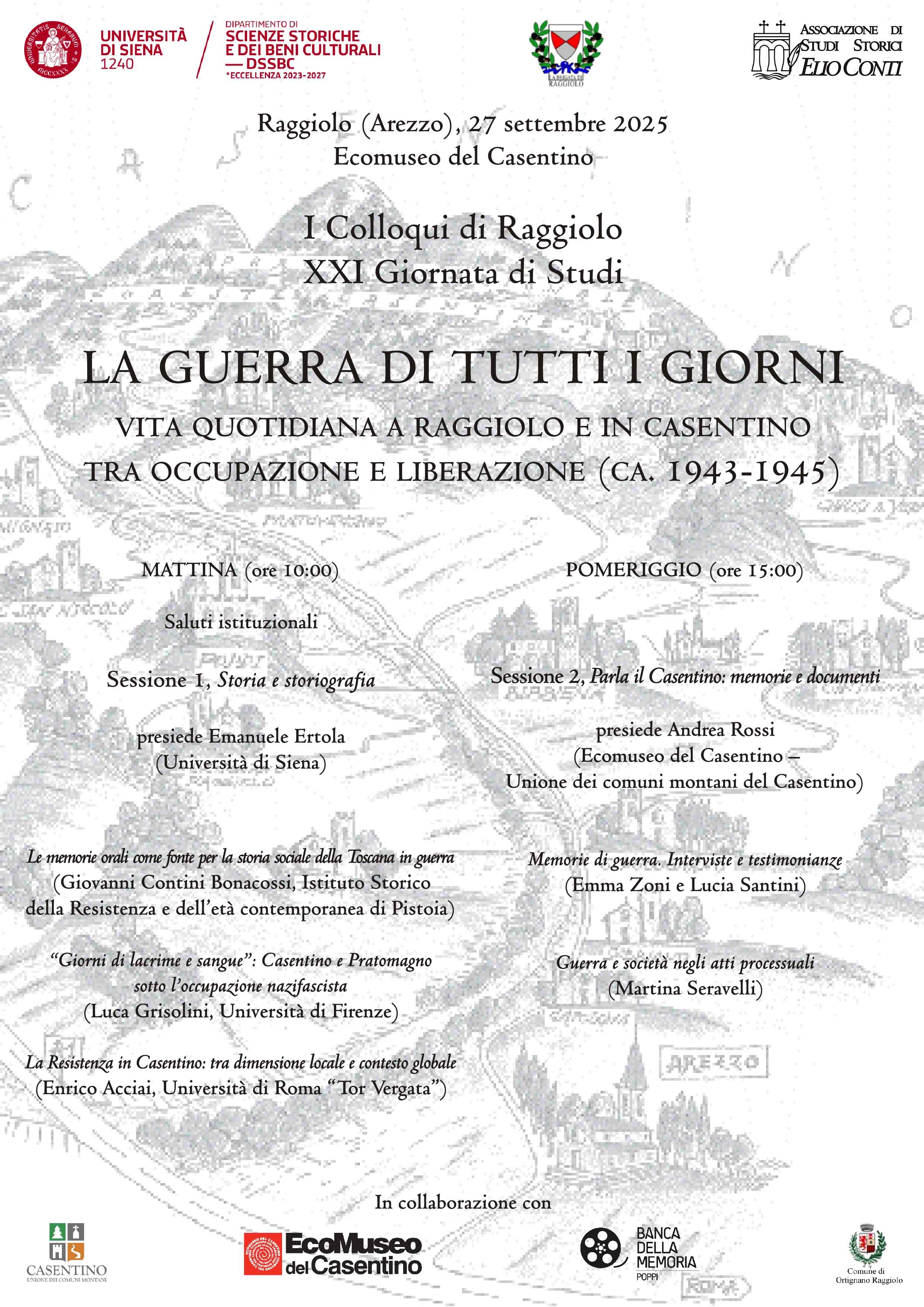 “Il progetto”, scrive il professor Emanuele Ertola dell’Università di Siena nella presentazione della giornata, “intende proporre un momento pubblico di alta divulgazione storica con l’obiettivo di restituire voce e profondità all’esperienza quotidiana della guerra, della Resistenza e dell’occupazione nazifascista, a partire da una prospettiva territoriale e microstorica. Attraverso il contributo di studiosi e studiose, ma anche grazie al lavoro diretto su fonti orali e documentarie condotto da giovani ricercatrici, l’incontro si propone di connettere la memoria del passato con la riflessione pubblica del presente, valorizzando il patrimonio di storie, testimonianze e saperi custodito nelle comunità locali”. Il programma de “I Colloqui di Raggiolo” sarà aperto dai saluti istituzionali e dalla prima sessione mattutina che, presieduta dallo stesso professor Ertola, prevederà gli interventi dal titolo “Le memorie orali come fonte per la storia sociale della Toscana in guerra” di Giovanni Contini Bonacossi dell’Istituto Storico della Resistenza e dell’Età Contemporanea di Pistoia, “Giorni di lacrime e sangue: Casentino e Pratomagno sotto l’occupazione nazista” del professor Luca Grisolini dell’Università di Firenze e “La Resistenza in Casentino: tra dimensione locale e contesto globale” del professor Enrico Acciai dell’Università di Roma Tor Vergata. Il dibattito proseguirà poi dalle 15.00 con la seconda sessione maggiormente legata alla memoria e ai documenti del Casentino che sarà coordinata da Andrea Rossi (direttore dell’EcoMuseo del Casentino) e che proporrà gli approfondimenti su “Guerra e società negli atti processuali” di Martina Seravelli e “Memorie di guerra: interviste e testimonianze” di Emma Zoni e Lucia Santini. L’intero convegno potrà essere seguito in diretta streaming dal canale YouTube dell’Associazione di Studi Storici “Elio Conti” e troverà il proprio compimento nella produzione degli atti con tutti gli interventi della giornata che arricchiranno la raccolta di documenti delle precedenti edizioni de “I Colloqui di Raggiolo” per promuovere nuove iniziative di tutela e promozione della ricchezza storica della vallata.