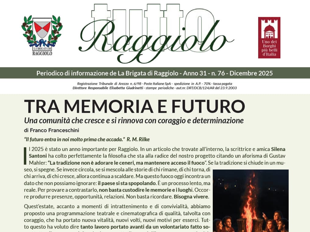 Il 2025 è stato un anno significativo per Raggiolo. Un anno che ha riaffermato un’idea semplice e profonda: la tradizione non si conserva chiudendola in un museo, ma mantenendola viva, capace di circolare, incontrare persone e generare nuove storie. Occorre creare occasioni di presenza, relazioni e opportunità, con un percorso che a Raggiolo è stato reso possibile grazie all’impegno costante dei volontari e grazie all’arrivo spontaneo di un gruppo di giovani che, con entusiasmo e semplicità, ha scelto di partecipare e dare una mano. Un gesto che racconta una comunità viva, capace di rinnovarsi senza perdere la propria identità. La sfida resta il futuro: costruirlo ascoltando i ritmi, i bisogni e i desideri di chi Raggiolo lo vive ogni giorno e di chi torna quando può.