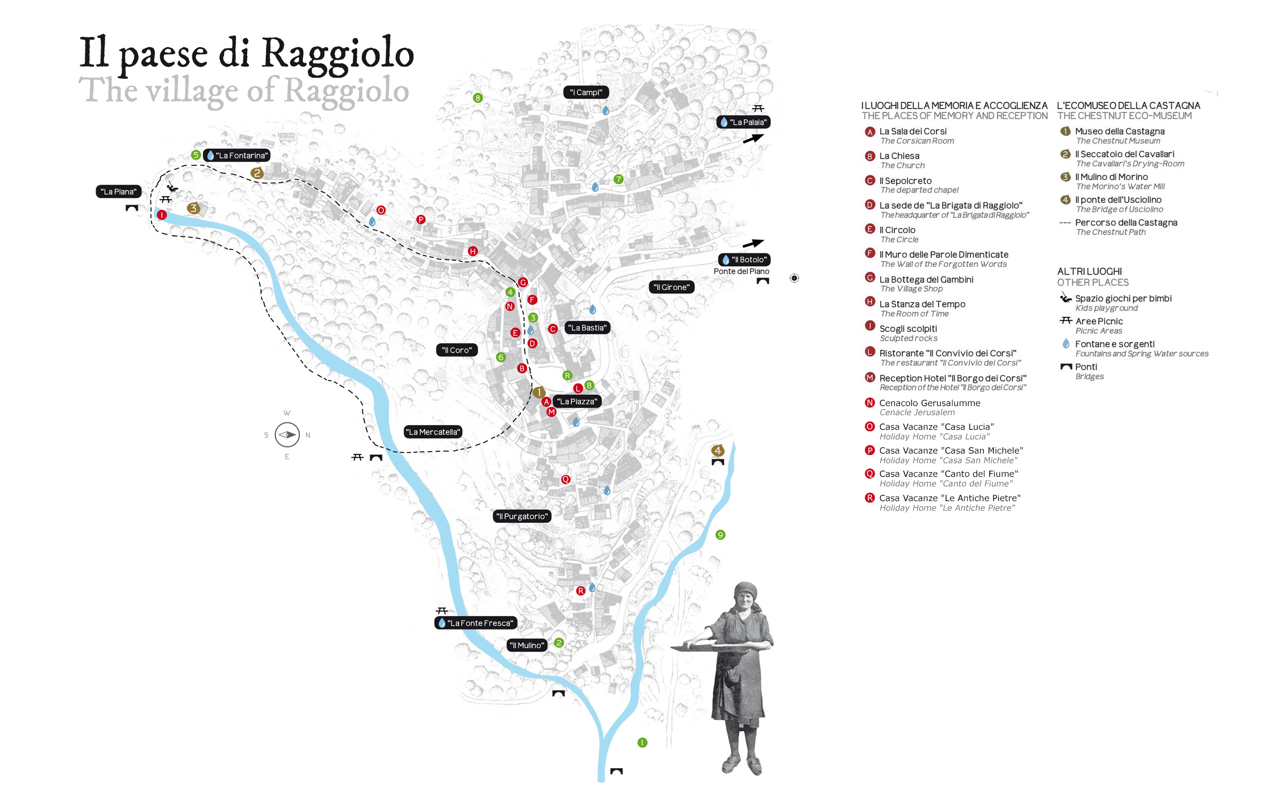 La Mappa del territorio di Raggiolo e dei suoi luoghi significativi è stata “disegnata” anni fa sulla base delle realtà percettive degli stessi abitanti. La Mappa, oltre a documentare la memoria e le micro-relazioni, anche affettive, che costituiscono il carattere distintivo del territorio, ha posto le premesse per le stesse operazioni di tutela e salvaguardia dei luoghi, mettendone in evidenza vocazioni e specificità.